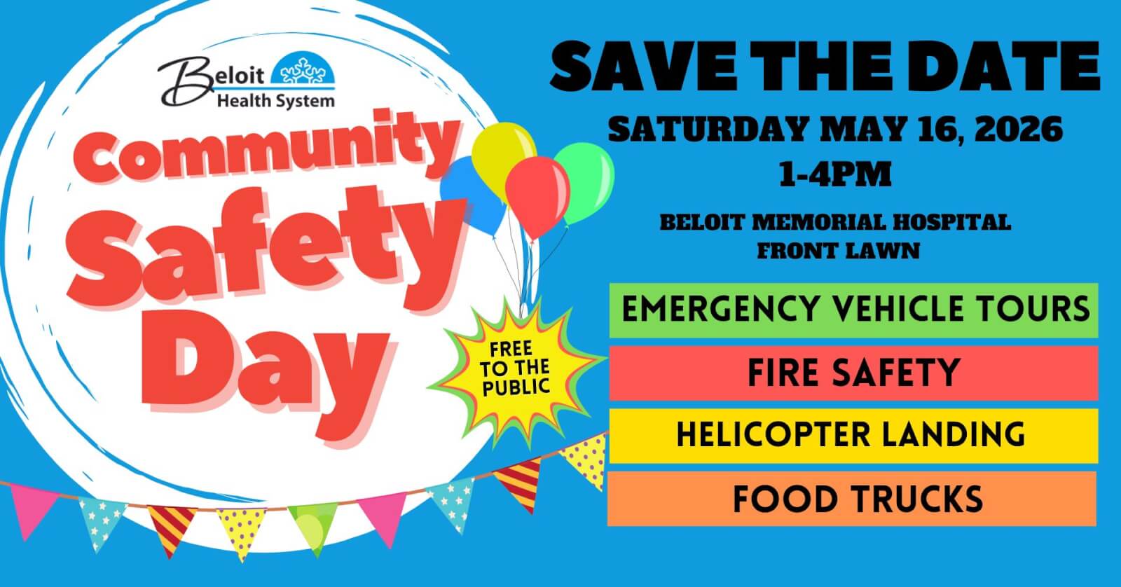 Join us for our 5th Annual Community Safety Day! The event will take place out on Beloit Memorial Hospital’s front lawn on Saturday, May 16, from 1-4pm. Kids will learn about all the different departments in the hospital as well as tour emergency vehicles with a UW Helicopter landing!