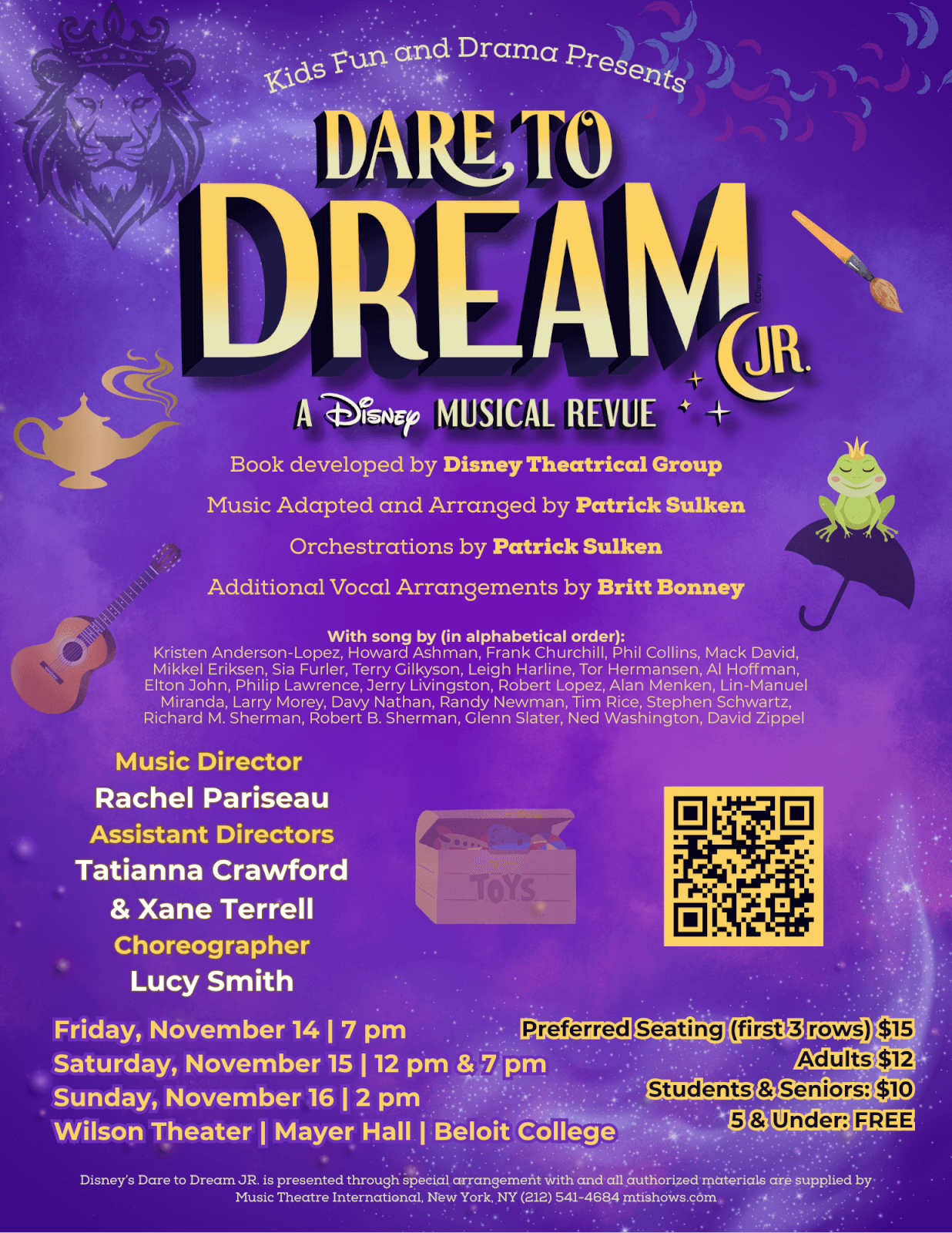 Disney’s Dare to Dream JR. is a 60-minute musical revue that follows an eager group of trainees on their first day at a fictional Walt Disney Imagineering Studio. As the group sets out to help each other discover their dreams, they work together to explore the power of dreams to unite, inspire, and make anything possible. Drawing from a century of beloved Disney films, Dare to Dream JR. features songs appearing for the first time ever in a Disney stage musical, including fan-favorites from The Princess and the Frog, Coco, Encanto, and Frozen II. This musical revue is a thrilling mix of contemporary songs, timeless classics, and brand-new medleys that are sure to surprise and delight Disney lovers of all ages.