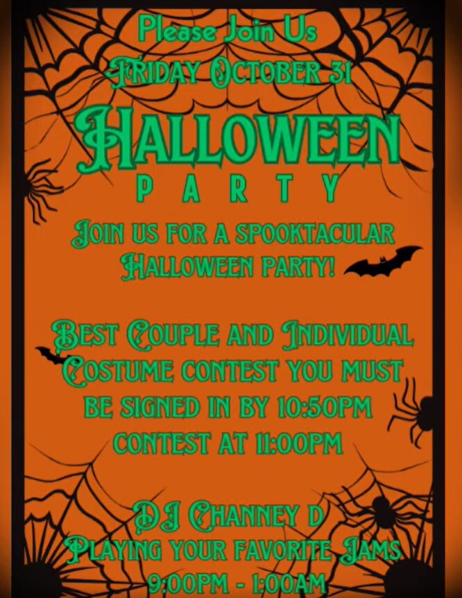 Join us for a great night, can’t wait to see your costumes this year!! Drink specials, music, costume contest.
