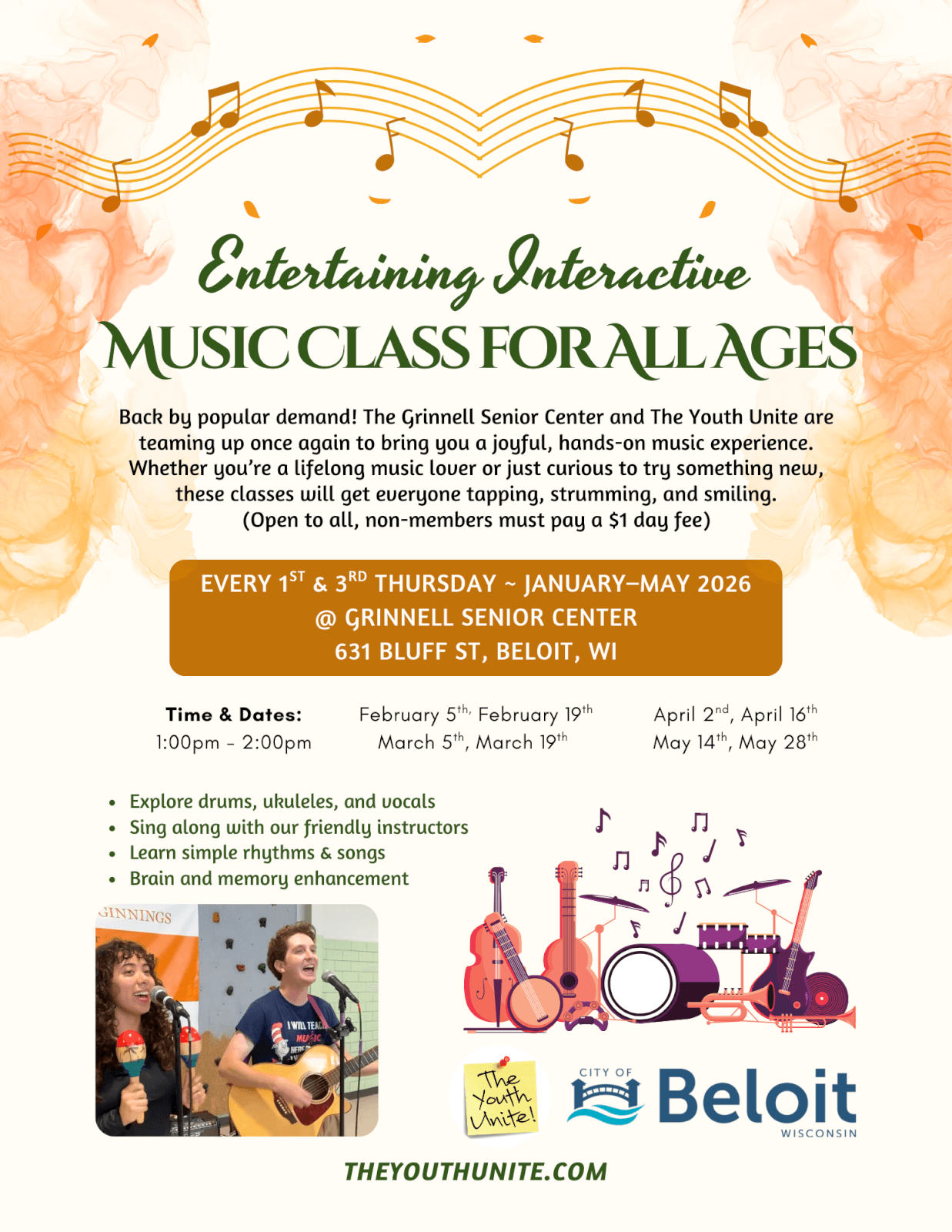 Back by popular demand! The Grinnell Senior Center and The Youth Unite are teaming up once again to bring you a joyful, hands-on music experience.