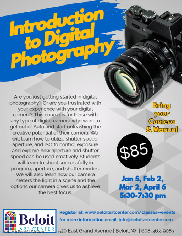 Are you just getting started in digital photography? Are you frustrated with your experience with your digital camera? This course is for those with any type of digital camera who want to get out of auto and start unleashing the creative potential of their camera. We will learn how to utilize shutter speed, aperture, and ISO to control exposure and explore how aperture and shutter speed can be used creatively. Students will learn to shoot successfully in program, aperture, and shutter modes. We will learn how our camera meters the light in the scene and the options our camera gives us to achieve the best focus. Bring your camera and manual.