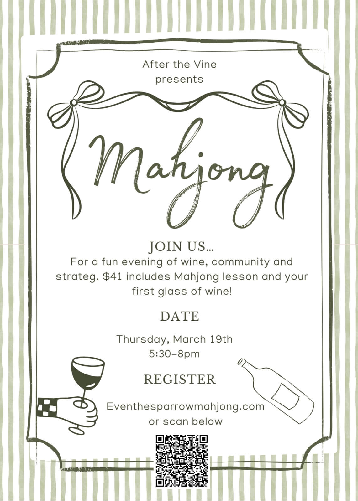 Learn the game that is Sweeping the Country!!! Mahjong!! We will have the game pieces, the teacher and the wine. Come Join the Fun!!!