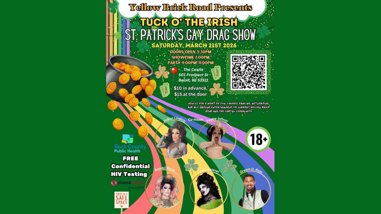 Join us for our Second Annual St Patrick’s Day fundraiser drag show! Tickets are $10 in advance, and $15 at the door. Saturday March 21st. Showtime is 7pm, but doors will open at 5:30pm. After the drag show there will be a dance party where we can dance our troubles away in a safe space! The event is 18+