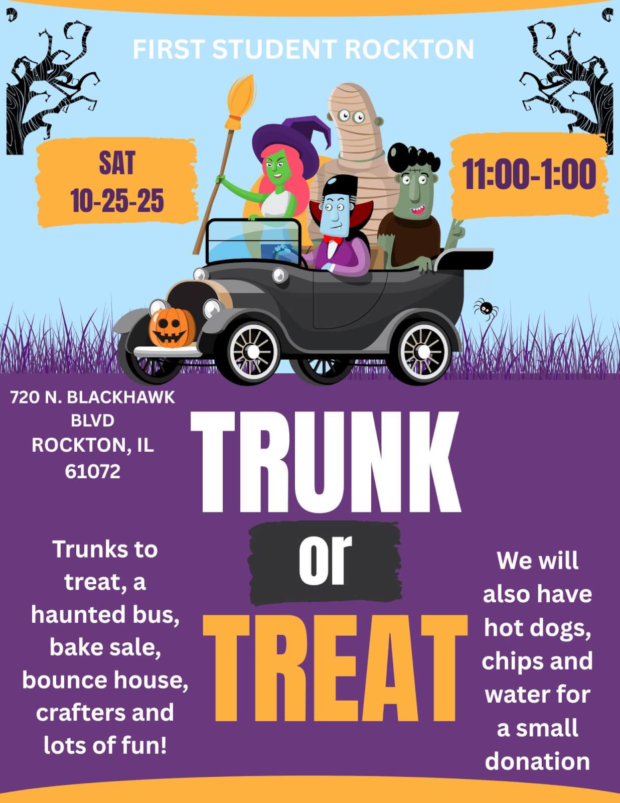 Join us for our annual Trunk or Treat event! There will be a haunted bus, bounce house, crafters, bake sale and hot dogs, chips and water for a small donation! Please join us.