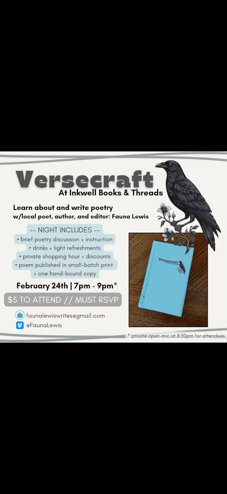 All participants will get to submit one poem written at the event to be published in a small-batch (30 copies) publication of Versecraft at Inkwell (see photo; pocket-poetry booklet is 5.5″x3.25″, locally printed and hand-bound), of which all attendees receive one copy. Additional copies will be available for sale at Inkwell until sold out.