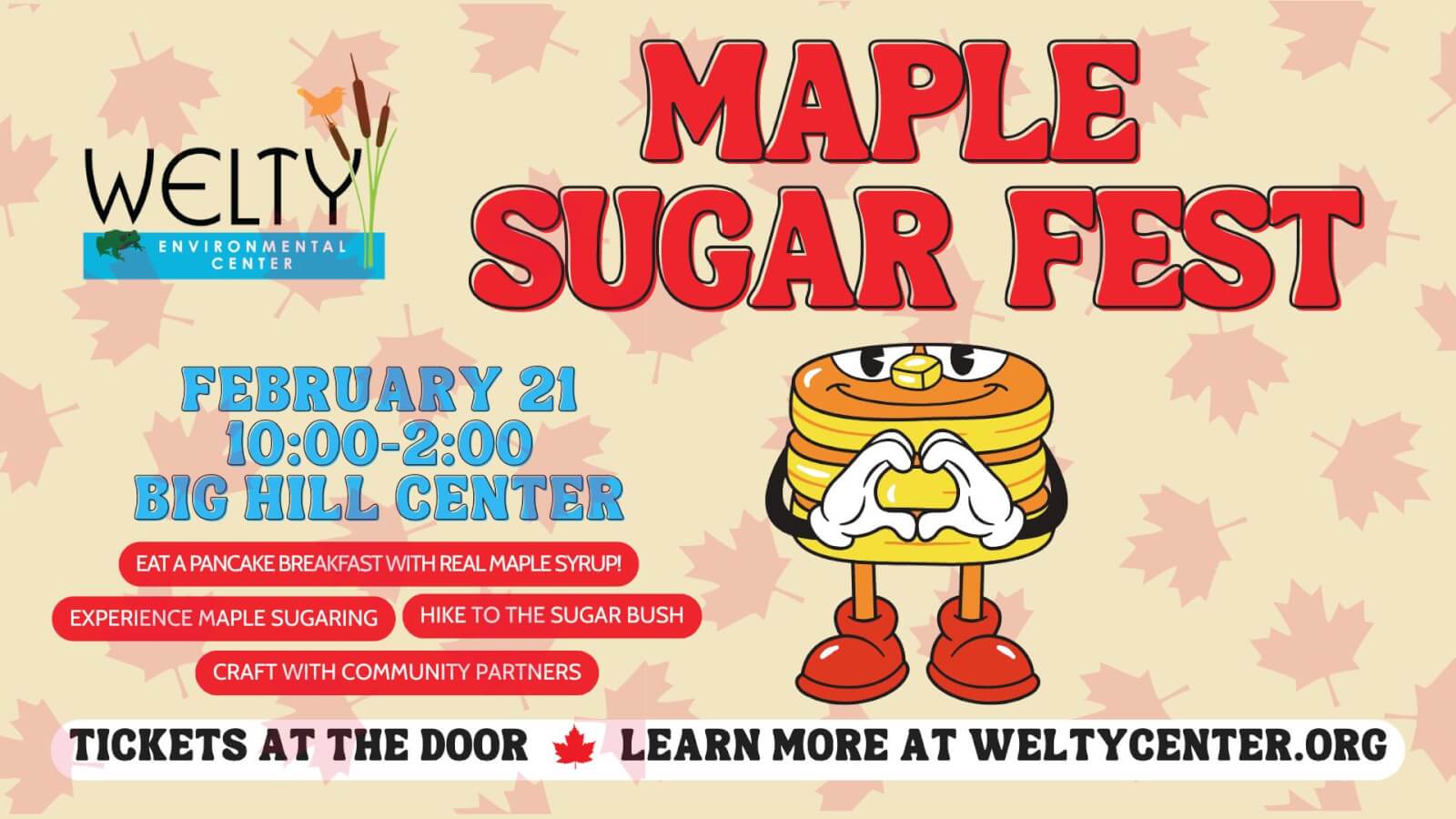 Join Welty Environmental Center for our 18th annual Maple Sugar Fest! See the tree-to-table process by hiking through the sugarbush in Big Hill Park, practicing the art of tapping sugar maples, observing the process of boiling sap, and tasting the final product by drizzling local syrup on freshly-made pancakes and sausages! Other activities include story times, basket weaving, wood carving, take-home crafts, maple snow cones, and so much more!
